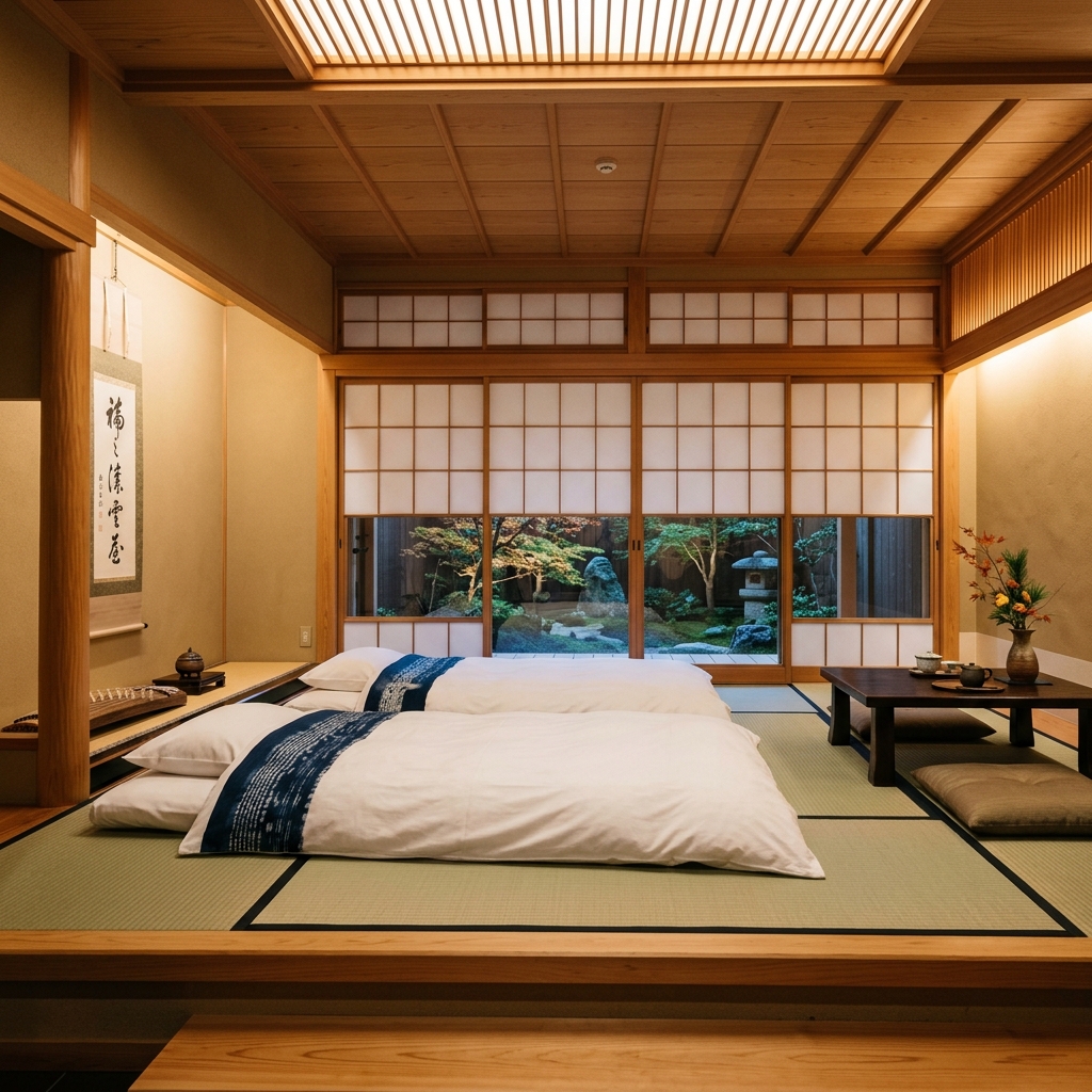 畳の香りが心地よく漂う、広々とした和室。 大きな障子から差し込む柔らかな光が、お部屋を優しく包みます。 寝具には最高級の羽毛布団を用意し、深い眠りへと誘います。